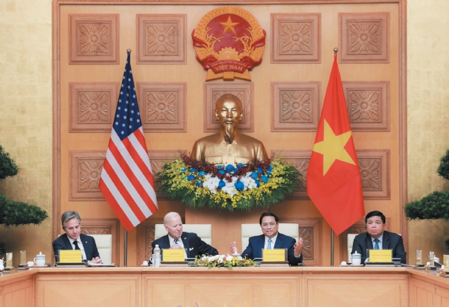 Prime Minister Pham Minh Chinh (third from left) and U.S. President Joe Biden (second from left) attend the Vietnam-U.S. high-level conference on innovation and investment in Hanoi, September 2023